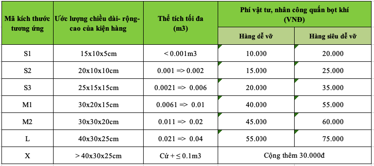 – Chi phí quấn bọt khí được xác định theo thể tích dựa trên kích thước thực tế của Kiện hàng theo bảng sau:
